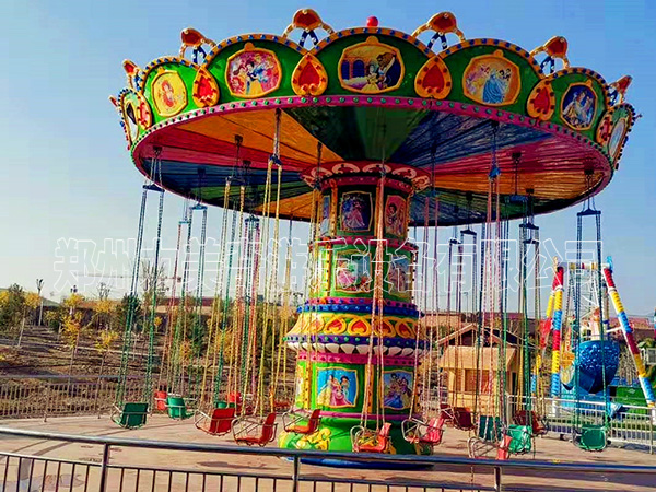豪華飛椅是一種新穎飛行塔類游樂設備。立柱作公轉(zhuǎn)運動,頂部大轉(zhuǎn)盤上升、傾斜、搖擺式反方向自轉(zhuǎn)運動,使得環(huán)鏈懸掛的乘客,在離心力的作用下起伏飛旋,三種疊加運動的結(jié)合,猶如芭蕾綻放,又如銀燕在睛空中飛舞。夜幕降臨,搖擺旋轉(zhuǎn)傘與城市霓虹交輝相應,疑是一道城市彩虹。游客乘坐在垂掛的吊椅上,隨轉(zhuǎn)盤的轉(zhuǎn)動而徐徐升起,仿佛在高空中飛舞翱翔,由于轉(zhuǎn)盤的升高,垂直柱頭角度漸漸偏轉(zhuǎn),使游客猶如置身于波濤起伏的大海中其樂無窮,再加上豪華靚麗的外觀裝飾,令人耳目一新,在運動中使圍觀之人眼花繚亂,直想一試為快,真是游樂園的亮點。
