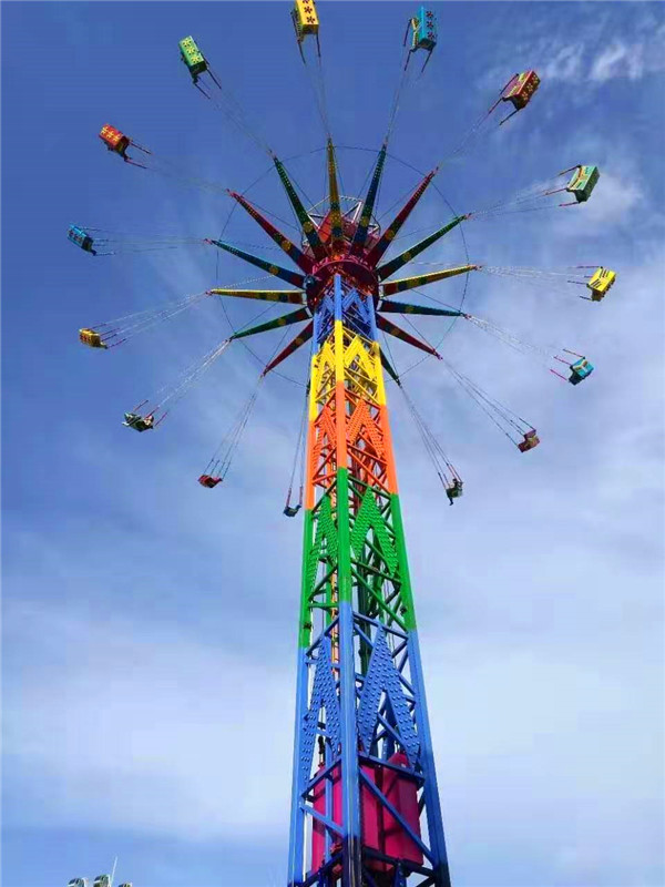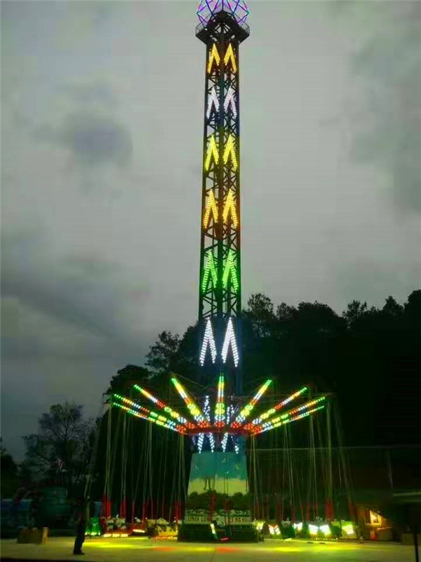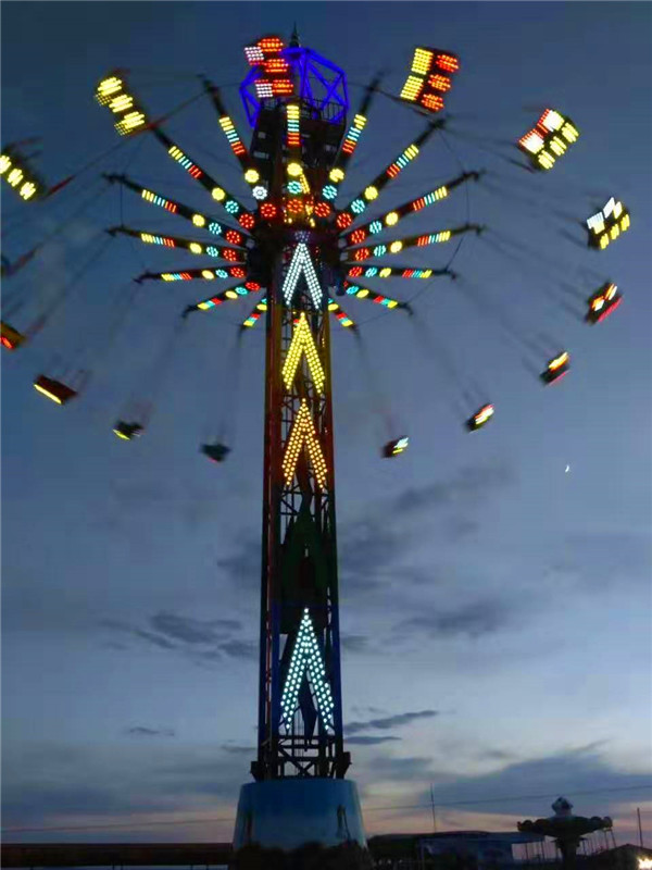 夜晚來臨,其高聳的塔身,在游樂園中更顯尊貴;五彩的燈光,在隨乘客旋轉(zhuǎn)運動中,猶如一道道彩虹當(dāng)空舞,更顯絢麗奪目,富麗繽紛。