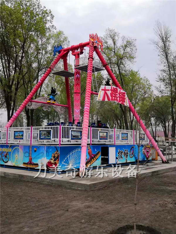 大擺錘是一種大型的游樂設(shè)備,常見于各大游樂園。游客坐在圓形的座艙中,面向外。大擺錘以壓肩作為束縛,配以帶作為二次保險(xiǎn)。座艙旋轉(zhuǎn)的同時(shí),座艙下面的推力器推動(dòng)著圓盤做單擺運(yùn)動(dòng)。大擺錘的運(yùn)行可以使置身其上的游客驚心動(dòng)魄。大擺錘屬于刺激型的大型游樂設(shè)備。