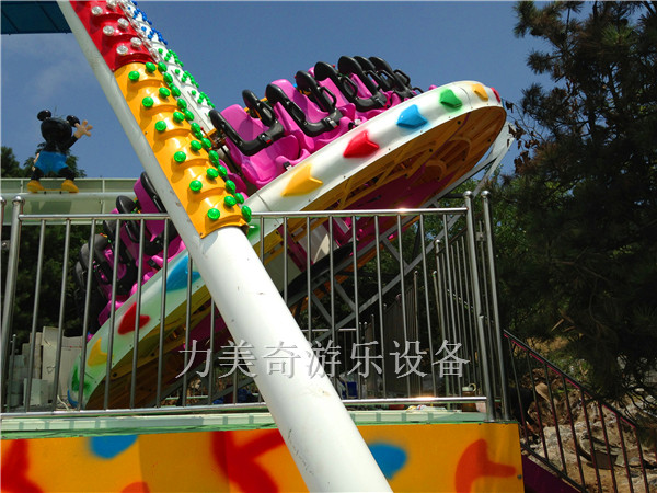 大擺錘又叫流星錘、大擺錘,是一種旋轉(zhuǎn)類的大型游樂設(shè)備,其運(yùn)動(dòng)原理是由時(shí)鐘鐘擺引發(fā)而來(lái),運(yùn)動(dòng)軌跡也是鐘擺形式,大臂下面帶有一個(gè)圓盤,在大臂做鐘擺擺動(dòng)時(shí),大臂下面的圓盤同時(shí)在做旋轉(zhuǎn)運(yùn)動(dòng),游客乘坐在旋轉(zhuǎn)的大擺錘上往復(fù)擺蕩,失重感令人目眩神迷;游客往往情不自禁的發(fā)出驚呼與歡笑,極大的提高了整個(gè)游樂場(chǎng)的歡樂氣氛,使許多游客留連忘返,遲遲不愿離去。