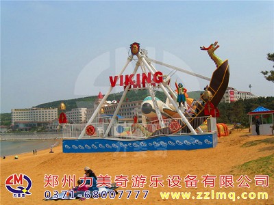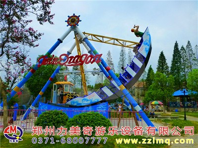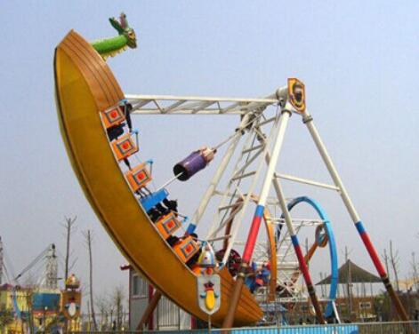 兒童游樂(lè)設(shè)備海盜船是一種全新設(shè)計(jì)的觀覽車(chē)類(lèi)游藝機(jī),是一種繞水平軸往復(fù)擺動(dòng)的游樂(lè)項(xiàng)目,該種游藝機(jī)因造型圖同而名稱(chēng)各異,“海盜船”因?yàn)槠渫庑畏鹿糯1I船而得名。海盜船造型為美洲印第安部落風(fēng)格,總高度7.2米,大擺角45度。