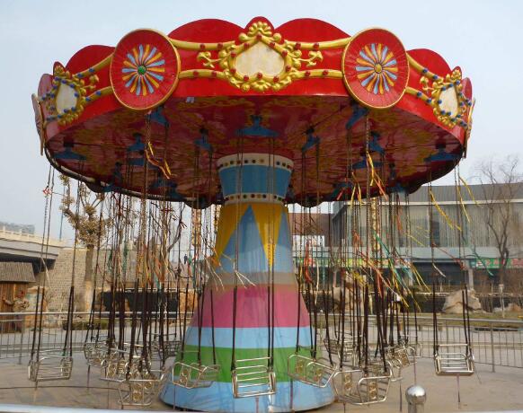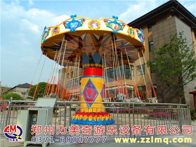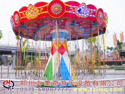 旋轉(zhuǎn)飛椅是一種新穎的飛行塔類(lèi)游樂(lè)設(shè)施,豪華的外觀裝飾,有趣的運(yùn)動(dòng)形式。游客乘坐在垂掛的吊椅上,隨轉(zhuǎn)盤(pán)的運(yùn)轉(zhuǎn)徐徐升起,仿佛翱翔于天際,又如置身于波蕩起伏的大海中,其樂(lè)無(wú)窮。游客座椅在離心力的作用下繞立柱起伏飛旋,好似銀燕在晴空中回旋飛舞,此起彼伏,上下飄飛。他集娛樂(lè)性、趣味性,驚險(xiǎn)和刺激性于一體。