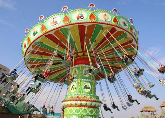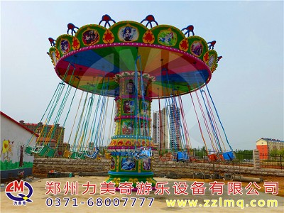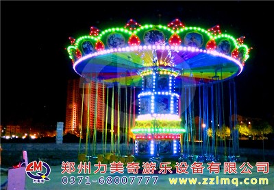 游樂設(shè)備旋轉(zhuǎn)飛椅是一種新穎的飛行塔類游樂設(shè)施,豪華的外觀裝飾,有趣的運(yùn)動(dòng)形式。游客乘坐在垂掛的吊椅上,隨轉(zhuǎn)盤的運(yùn)轉(zhuǎn)徐徐升起,仿佛翱翔于天際,又如置身于波蕩起伏的大海中,其樂無窮。游客座椅在離心力的作用下繞立柱起伏飛旋,好似銀燕在晴空中回旋飛舞,此起彼伏,上下飄飛。他集娛樂性、趣味性,驚險(xiǎn)和刺激性于一體。