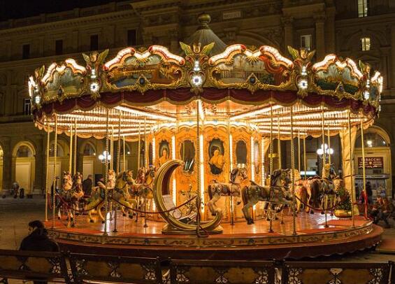 旋轉(zhuǎn)木馬或回轉(zhuǎn)木馬游樂場機動游戲的一種,即旋轉(zhuǎn)大平臺上有裝飾成木馬且上下移動的座位供游客乘坐。很早記錄的旋轉(zhuǎn)木馬出現(xiàn)于拜占庭帝國時期。約1860年歐洲出現(xiàn)排名靠前個以蒸汽推動的旋轉(zhuǎn)木馬。旋轉(zhuǎn)木馬成為每個大人孩子心中的童話世界不可缺少的裝飾,如今在各大小游戲場、商場等地方皆有各式旋轉(zhuǎn)木馬。