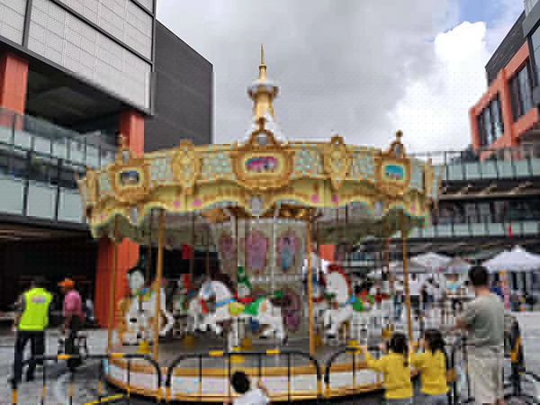 鄭州力美奇游樂(lè)設(shè)備有限公司生產(chǎn)的36座豪華轉(zhuǎn)馬,內(nèi)外頂棚及中柱都采用了玻璃鋼材質(zhì),由無(wú)數(shù)匹馬兒、豪華馬車、小驢、鴕鳥、長(zhǎng)頸鹿、鴕鳥、獅子等動(dòng)物組成,頂部有華麗無(wú)比的皇冠。當(dāng)夜幕降臨,五顏六色的燈光亮起,更顯現(xiàn)出它的豪華跟華麗,成為樂(lè)園很耀眼、受歡迎的焦點(diǎn)項(xiàng)目。