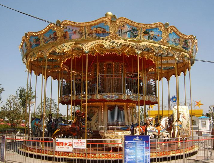 大型雙層旋轉(zhuǎn)木馬是一種垂直軸類單轉(zhuǎn)體起伏型游藝機(jī),是模擬跑馬廳的娛樂活動而設(shè)計的,該游藝機(jī)的上部設(shè)有彩色的錐形頂棚,頂棚的周圈裝有五彩繽紛的玻璃鋼裝飾板,更顯豪華氣派,儼如華麗的跑馬廳。